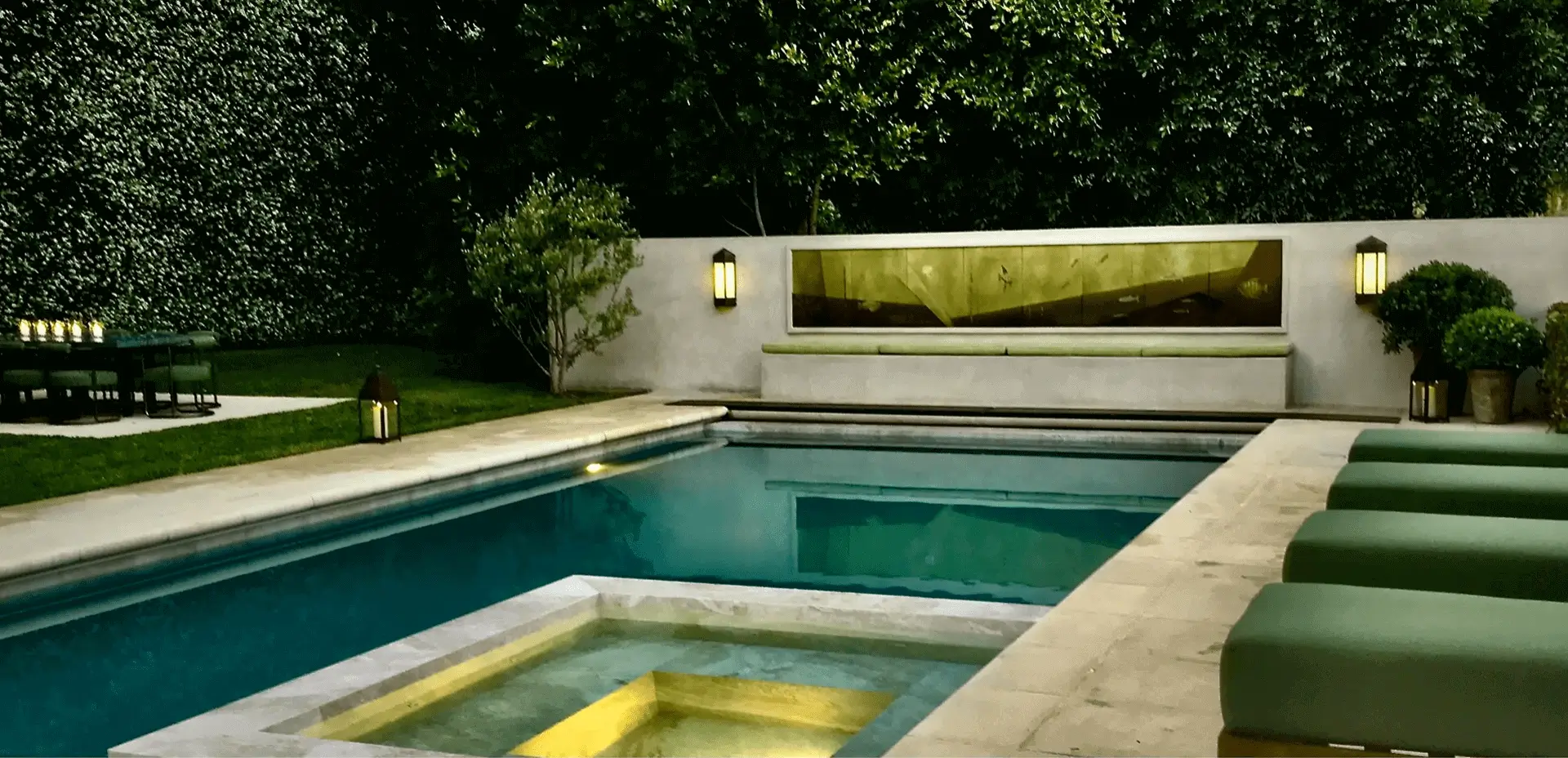 A modern backyard pool illuminated at night with a hot tub.